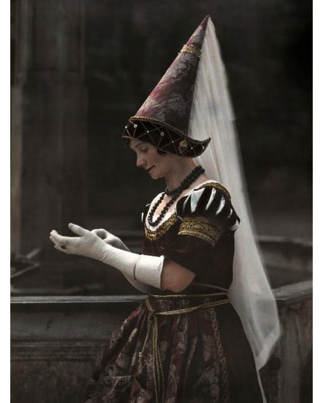 花園あずき ここでいくつかドレスを抜粋してご紹介 まずはトンガリ帽子 エナン が特徴的な中世後期ドレス この頃は髪を帽子 で隠す風習でした 豪華な帽子が数多く登場します 次にルネサンス前期 表紙にも用いたベーシックなドレスです アクセサリが
